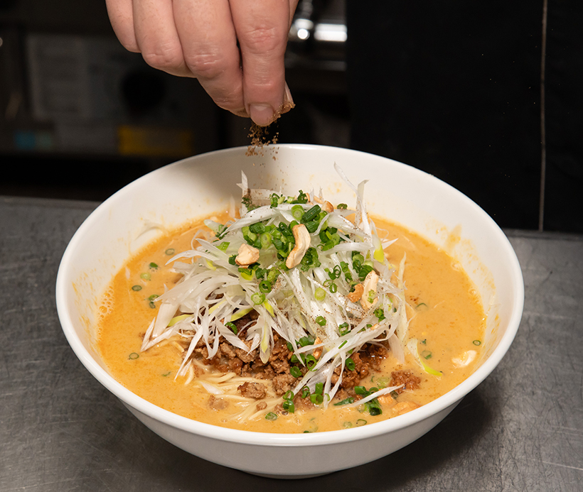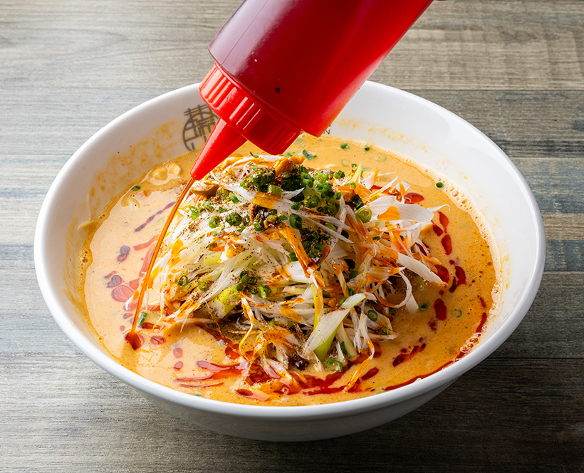 さらに、「担担麺は具材の多いメニューではありません。具材が少ないと、色味が限定されます。だからこそ、どう配置するかが大事なんですね」。たっぷりの白髪ネギの白に、トッピングされた小ネギの緑、粉末にした山椒の黒が映える。仕上げに、ディスペンサーに入ったラー油を垂らす。ラー油の赤が冴え、まるでアートのような「担担麺」という作品が完成する。