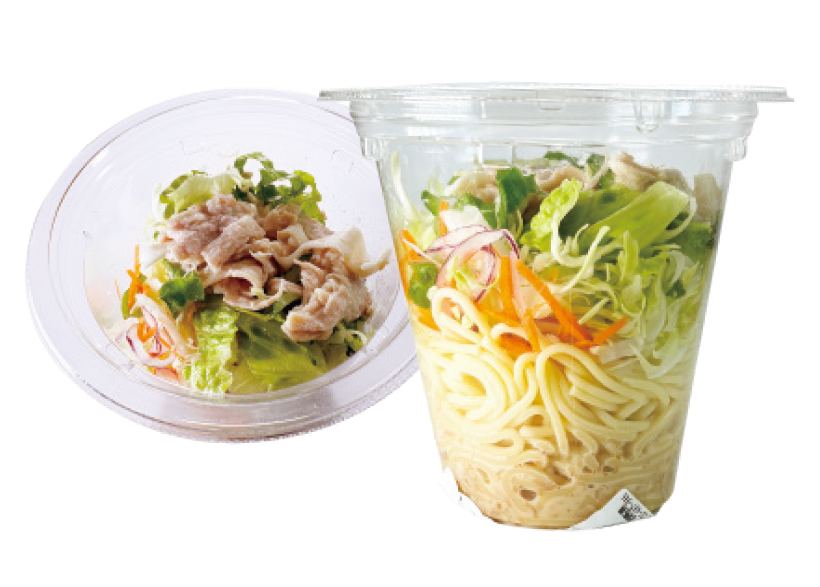重量253g。サラダをシェイクして楽しく食べる提案。パスタの量が意外と多く、「ハーフパスタ」として軽いランチの一品にしてもOK。男性には同シリーズの「海老明太子」の方が人気が高く、「豚肉を食べるならがっつりイキたい」といった考え方によるものか