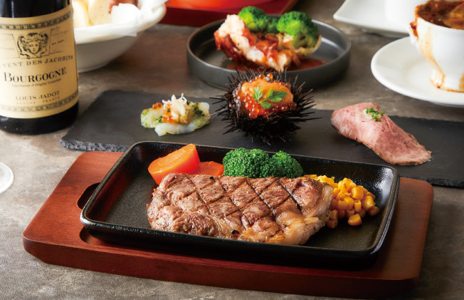 【俺の炭火焼ステーキ 渋谷】「黒毛和牛ステーキコース」 9,000円(税込み) 「俺のBakery」のパン2種食べ放題に、前菜盛り合わせ、サラダ、オニオングラタンスープ、牛すじ煮込み、黒毛和牛150gを使用したステーキ、デザートが付いたコース