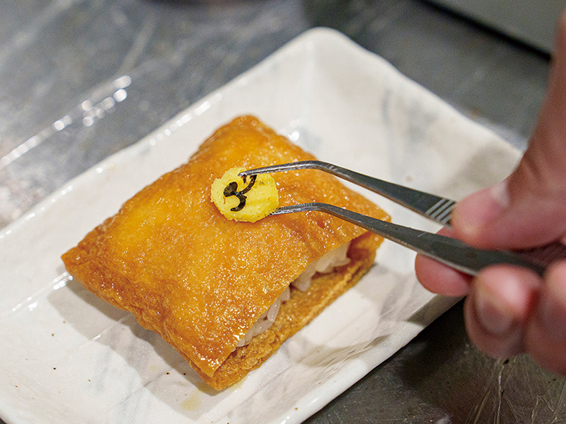おいなりさんは仕込み時に酢飯をあらかじめ詰め置きができ、調理面でもメリットが大きい。注文を受けたら型抜き済みの海苔をピンセットで置くだけ。1分もかからず完成する。