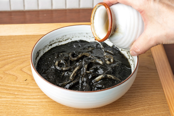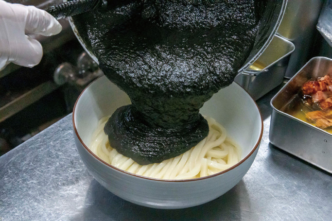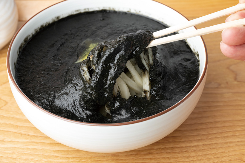 メニュートレンド:伝統と革新の真っ黒うどん イカ墨カレー×うどんの黒白インパクト
