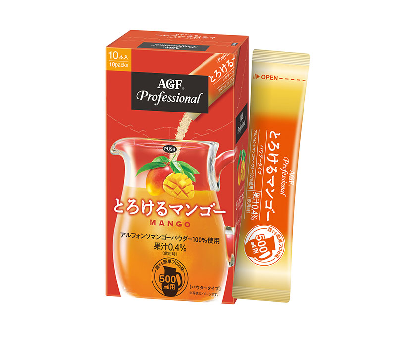 ホテルビュッフェやレストランのドリンクバーなどで特に好評。18~19gスティックタイプで500mlの各種ドリンクが完成し、割材にも活用できるため現場で評価されている。果実感のあるフレッシュな味わいも魅力。