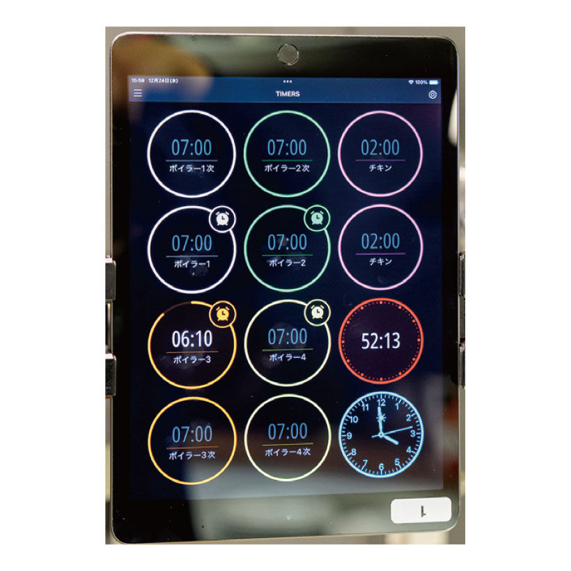 複数のパスタのゆで時間を管理するために採用。異なるタイマー色やアラーム音を設定でき、勘違いによるミスを予防。また設定時間後の経過時間も計測できるため、ゆで麺をソース鍋で煮込む時間もシームレスに計測。理想の食感を標準化しやすい。