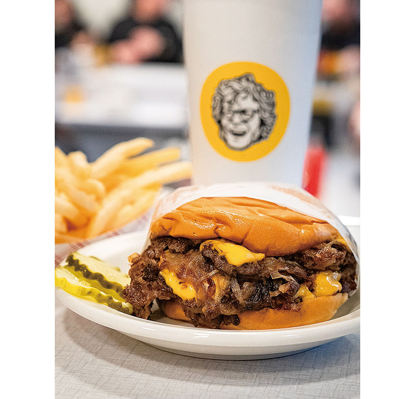 同店のバーガーは、2種類。クラシック・スマッシュ・バーガーは、バーガー誕生時の伝統的な方法で作るバーガーだ。現在一般的に行われているように機械で平らに成形して冷凍したパティではなく、生のミンチ肉をボール状にしたものを使う。鉄板にのせて塩・コショウし、軽く両面を焼いてから、特製のフライ返しで平らに押しつぶして(スマッシュ)、さらに焼く。肉汁が表面に浮かび上がってきたら、ひっくり返し、焼けた面にチーズをのせ、金属製の丸いカバーをしてチーズを溶かしながら、もう片面を焼く。ほどよく焼けた頃を見計らって、バターを塗ってトーストしたポテトパンのバンズにのせ、みじん切りにした玉ネギとマスタード、ピクルスを加えて、出来上がり。