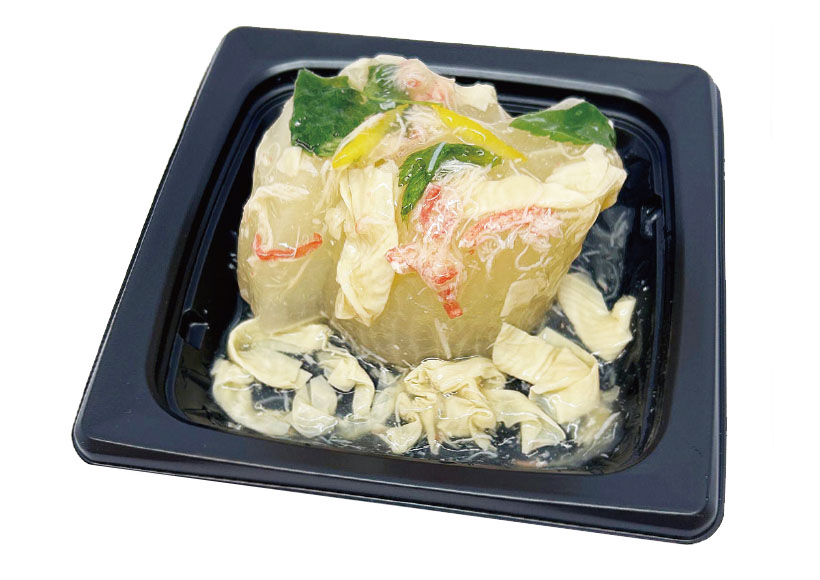 岩手産の凍み豆腐にキノコ、ニンジン、銀杏を合わせ、とろ~りとしたあんをまとわせたやさしい一品。「じんわりほかほかおいしそう!」という幸福感を彷彿とさせるビジュアルこそがあんかけ惣菜の真価を左右するが、同品の見栄えは申し分なしだろう。鉄分、カルシウムが豊富で栄養価が高い凍み豆腐は水分を含みやすく、あんのうまみが中までじんわり染み込む。銀杏が食感の変化と彩りのアクセントに一役買っており、全体のグレードを高めている。素材をしみじみと楽しめる冬にぴったりの一品だ。