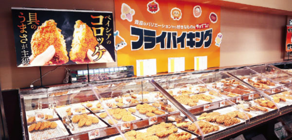 「揚げ物は家庭では手がかかる」「スーパーの店内調理でも専門店と変わらない味が出せる」と、ベイシアではフライに特に注力している。パック売りのほか、よりどりみどりの「フライバイキング」としても販売。「バイキング形式で販売する方がサクサクの手作り感が保てる。選ぶ楽しさもあり、フライバイキングはスーパーの惣菜売場になじむ」と茂木部長。