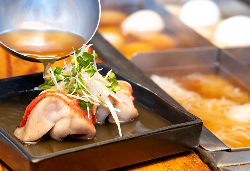 「金目鯛の炙りつゆかけおでん」 想定価格 780円(税抜き) 金目鯛の皮目をあぶり、鱧だしと「野菜だし」を合わせただし汁でさっと炊き、仕上げにだし汁をたっぷりとかけて提供。「野菜だし」ならではのうまみが余韻を残す仕上がり