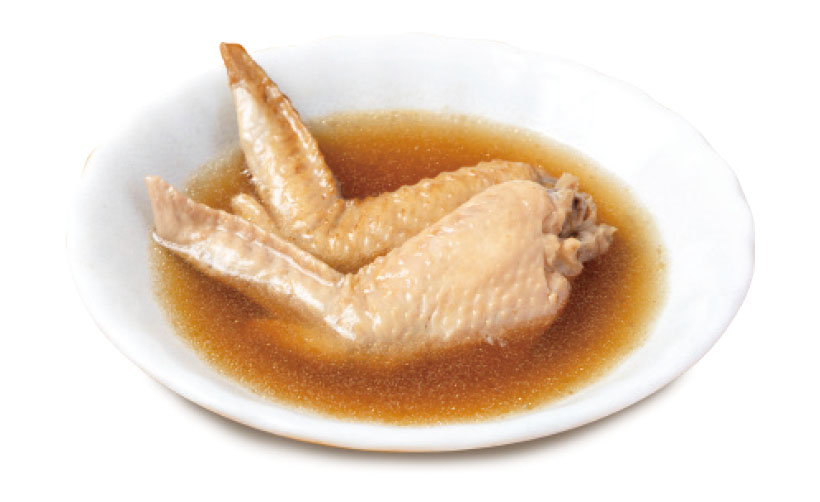 カゴメ「野菜だし調味料(濃縮タイプ)」(以下「野菜だし」)を味見し、「トマトのうまみを思わせる野菜ならではのおいしさが印象的。肉などの動物性の具材と相性が良い」と感じたという本間保憲社長。早速、商品開発部の岩崎勇介マネージャーと共に、店自慢の鱧だしと「野菜だし」を合わせただしで煮込む「手羽先のおでん」を試作した。「野菜だしを入れると、野菜らしいやさしいうまみが加わる。動物性だしほどの強さがない分、素材そのものの味を引き立ててくれるタイプのだしですね」(本間社長)、「鱧だしと合わせて煮込んだところ、手羽先のにおい消しにもなり、風味が加わった。下味もしみ込みやすいですよ」(岩崎マネージャー)というのが両氏の感想だ。