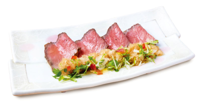 「野菜だしはバランスの良い塩味も入っているから、洋食のソースのような使い方もできる」(本間社長)と、サイドメニューの試作も進め、完成したのが「和牛イチボのローストビーフ」。大根おろしに「野菜だし」をかけ、香味野菜のみじん切りを合わせたものをローストビーフに添えた。「野菜だしはセロリなどの風味も感じられるから、香味野菜と和えると好相性。味がブレないので使いやすい」(岩崎マネージャー)という。