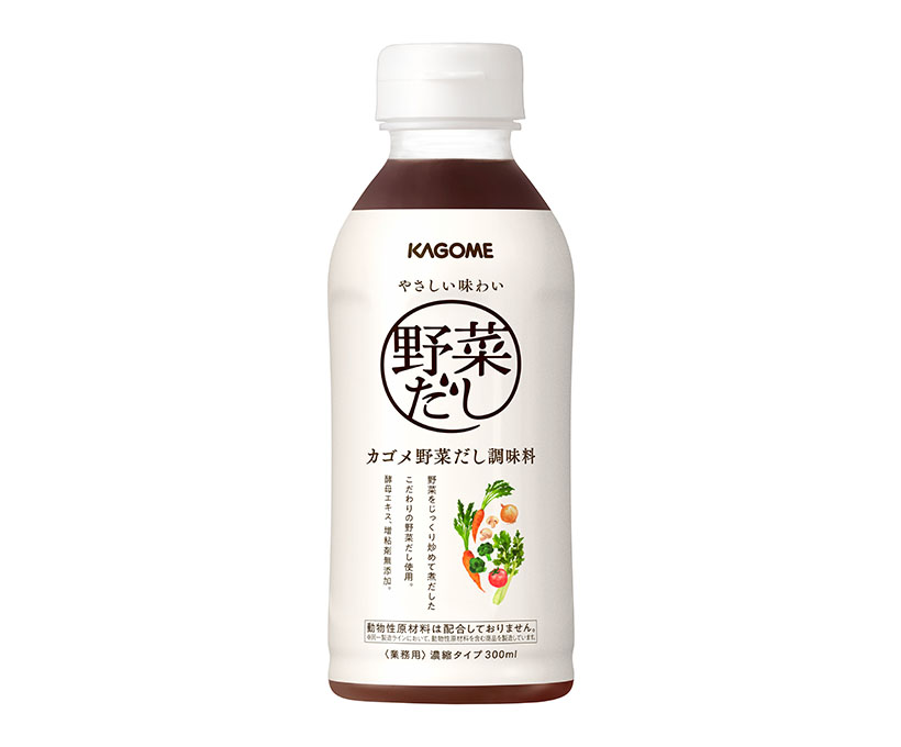 じっくりと炒めた野菜から手間暇かけてとった野菜だしをベースに、トマトとマッシュルームのうまみを加えただし調味料。素材のおいしさを引き立て、複雑なうまみのある味わいに仕上がる。野菜を炒めた香りや調理感も付与できる。/規格=300ml(常温)