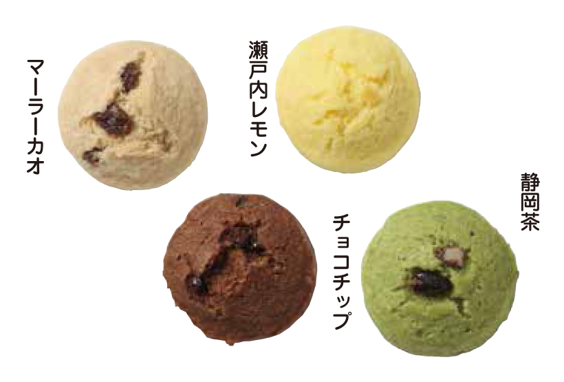 20が付くのでお約束の1個20g。しかもフレーバーの違う4種を一気に品揃えしました。「マーラーカオ」は、沖縄産黒糖と少し醤油を加えた生地にレーズン入り。「静岡茶」は、緑茶風味の生地に北海道産小豆の甘いかのこ入り。「瀬戸内レモン」は、瀬戸内レモンピールを入れることで爽やかな味わいと、きれいな黄色に仕上がっています。「チョコチップ」は、ガーナ産カカオマスを使ったスイートチョコレートを生地に練り込んで、チョコチップ入り。ビター感と甘味がほどよいバランスで、おいしいです。