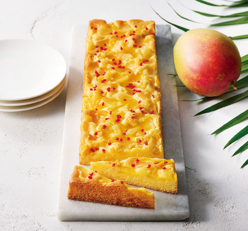 マンゴーピューレとクリームチーズを練り込んだ生地にパイナップルとマンゴーをトッピングした華やかなケーキ。自由なサイズにカットできて提供しやすい/規格=460g×6本(2.76kg)(冷凍)