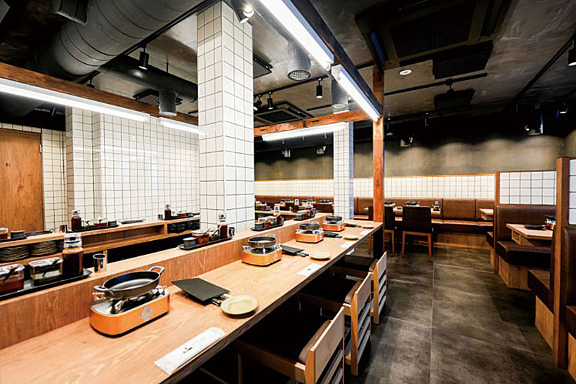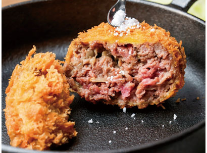 さらに、同店で提案している「メンチカツの新しい食べ方」が何といっても斬新だ。カラッと揚げたメンチカツを卓上の鉄板で断面を焼いて食べるスタイルで、3つのメンチカツを一つずつ、タイミングを分けて提供。塩、定番ソース、ポン酢、青唐醤、デミグラスソースなど各種用意されている調味料を、鉄板で好みの焼き加減にした熱々のメンチカツを、それぞれ異なる味わいで楽しめるのだ。