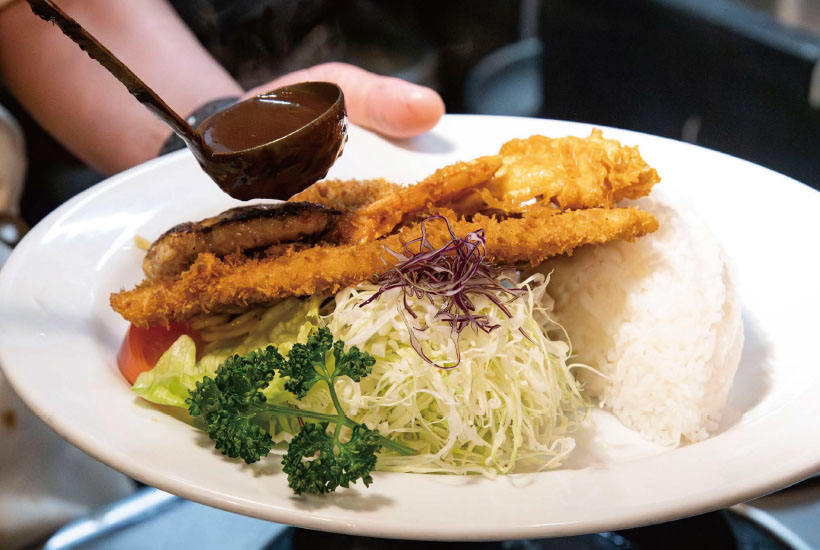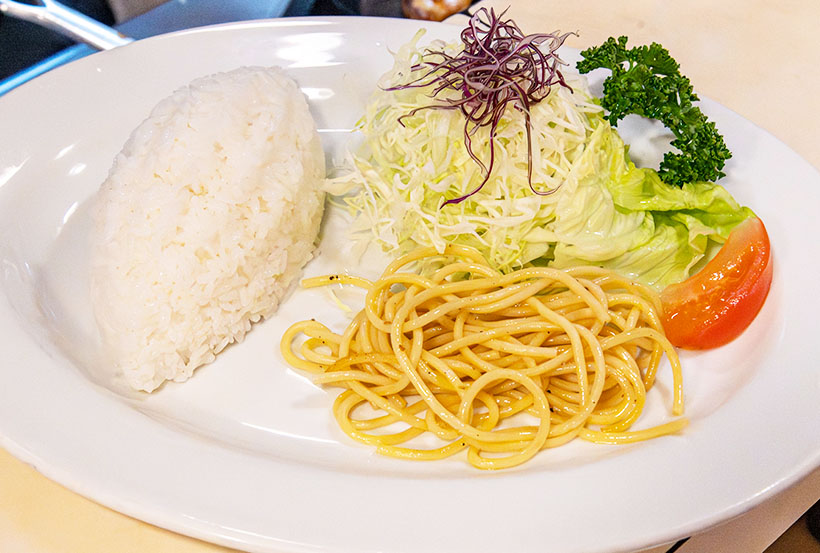 豚カツ、ハンバーグ、エビフライ、鶏の唐揚げ2つ、目玉焼きが、35cm×27cmの大皿に盛り付けられ、大好物のオンパレードで「どれから食べようか?」とワクワクせずにはいられない。ボリュームも、おいしさも、楽しさも、まさに“ジャンボ”級のメニューだ。