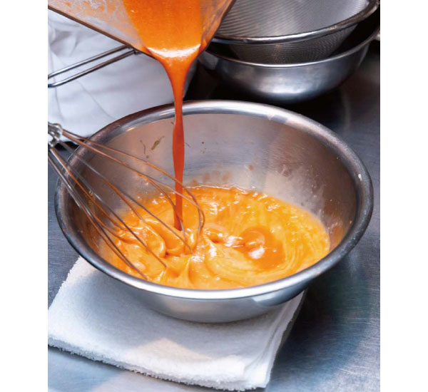 次に考案した「ベーストマトソースとエビ、オレンジの茶碗蒸し サルデーニャ・スタイル」は、イタリア・サルデーニャ島の郷土料理を茶碗蒸しに昇華した意欲作。エビだしと卵とベーストマトソースを合わせて蒸し固め、その上に伊予柑をベーストマトソースで和えてトッピング。香ばしい魚介の風味と、さっぱりと爽やかな柑橘の酸味が「ベーストマトソース」とマッチしている。
