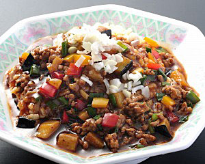 中華おこげ(市販品40g)豚ひき肉(20g)ナス(1cm角30g)タケノコ(6~7mm角20g)ピーマン(7~8mm角10g)赤・黄パプリカ(各7~8mm角8g)長ネギ(みじん6g)ニンニク(みじん3g)根ショウガ(みじん2g)甜麺醤(20g)豆板醤(8g)中華醤油(3ml)中華がらスープの素(3g)砂糖(2g)水(60ml)片栗粉(2g)サラダ油(炒め用10g)