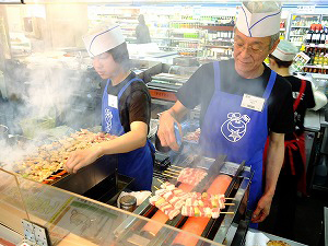 発祥は1968年。夜の酔客が「お弁当ある?」と尋ねたのがきっかけ。するとレジをうっていた創業者、長谷川文夫氏は、店で作っていた「やきとり」(豚ばら串焼き)と「おにぎり」の材料(白飯と海苔)を組み合わせ、即興でやきとり弁当をこしらえた。これが人気を呼び名物に定着した。