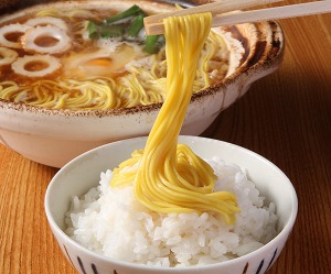 白飯はひとくちごはん50円、小100円、大150円。今回、ラーメン博物館で提供している白飯は、通称「香り米」という高知産のコメで、四万十川源流の地域で生産されている