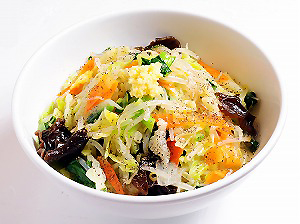 (1)本品を水で4倍に希釈し冷蔵庫で冷す。(2)野菜、肉をボイルし、あら熱をとって冷蔵庫で冷ます。(3)中華麺をゆで、冷水でよくしめる。(4)中華麺を皿に盛り、具材をのせ、スープを皿に注ぐ。