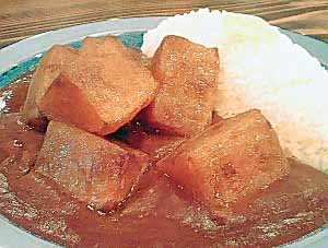 その一つ、「直角大根カレー」は、大振りの大根約4分の1本分、厚さ5cmほどの輪切り1.5枚分が、カレーソースの上にゴロッとのせられている。