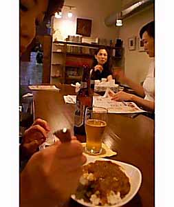 仕事帰りにサラッと飲んで帰ってほしいと08年3月には、「ちょい飲み300円」のバータイムもスタート。店内は、白い壁と木目調が一見カレー屋とは思わせないカフェ風の造りで、女性客が仕事帰りに立ち寄っても何ら違和感なし。アルコール類のほか、キーマ&クラッカー、バジルとペッパーのチーズやイベリコ豚のパリパリ餃子などがほぼ全品300円。ビール2杯とつまみ1皿なら週に2度は通える価格設定だ。