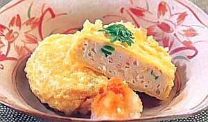 白身魚のすり身に豆乳、カニを加えて、ふんわりなめらかな食感に仕上げている。カニ風味のあんが見た目とおいしさをさらに引き立てる。水溶きした天ぷら粉を付け、180度Cの油で約5分揚げるか、10分蒸す。