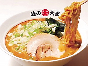 「味の大王総本店」の立地は苫小牧市郊外の国道36号線沿い。荒れ地に見まがう閑散地帯だが、平日150~200人、週末450~500人を集客。客層は地元客・観光客半々、老若男女に偏りはなく、9割がカレーラーメンを注文するという。現在、総本店のほか、のれん分けを含め5店舗を展開。北海道には1万軒のラーメン店があり、毎年その3分の1が新陳代謝されるといわれるが、カレーラーメンの普及に比例し堅調に業績を伸ばしている。