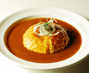 丸型で成形した白飯を皿に盛り、卵1個分の薄焼き卵をのせ、カレールウを薄焼き卵に上がけし、玉ネギスライスとパセリみじんを添えれば完成。これを基本に、チキンカツ、ポークカツ、エビフライなど、好みのトッピングを追加できる。カレールウのレシピ詳細は、別掲(料理写真左横)の通りだ。
