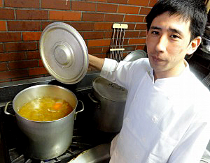 (1)鶏がら3kg、豚骨5kgを約50リットル寸胴に入れ、水を加えて約4時間炊き出し、カレールウのスープベースとする(2)愛媛県産の完熟玉ネギ10kg、ニンジン1kg、ジャガ芋500gをみじん切りにして、よく炒め、冷ましてミキサーにかける(3)(1)に(2)を加え、炊き合わせる(4)スープをこし、独自配合したカレースパイスを加え合わせる。