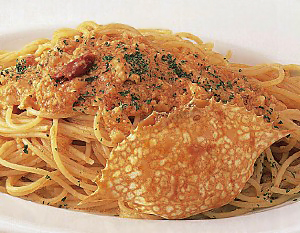 一番人気メニュー「渡り蟹のトマトクリームスパゲティ」の登場は8年前の2003年。それ以前は「トマトとニンニク」「カルボナーラ」「ミートソース」など創業以来変わらぬ品揃えだったが、「カニを使った新スパゲティが食べたい」というお客の声から商品開発した。期間限定で提供したところ、好評を得て翌年定番メニュー化した。