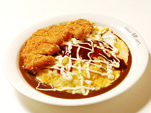 玉ネギ、マッシュルームを炒め、溶き卵を加えて薄焼き卵とし、カレーライスにのせる。特製ソースは、豚カツソース、ウスターソース、ケチャップ、醤油を5対3対1対1でブレンドしたもの。これを薄焼き卵に約30ccかけ、マヨネーズをあしらう。