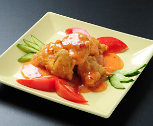 鶏むね肉にニンニク、根ショウガなどで下味を付け、ベーキングパウダーを加えた衣でフンワリと揚げたものに、マヨネーズを30%加えたスイートチリソースを上がけした、つまみに絶好の、若者向き料理。ご飯にも向く。