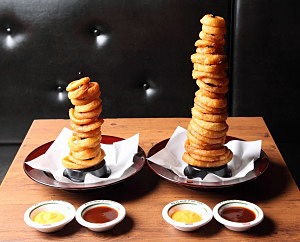 ◆店中が注目!オニオンリングのタワー 見た目と話題性を兼ねたアイデア提供