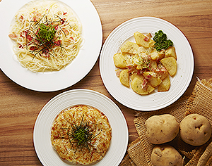(1)ジャガ芋をスライサーで麺状にカットし、水にさらして、水気を切り、仕込み置きする(2)注文後、熱湯で軽くボイルし、フライパンに移し、ベーコンを加えて炒め合わせ、塩、コショー、バターで調味する(3)皿に盛り、刻み海苔、青シソを添える。