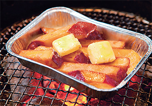 そんな七輪活用のホットメニューでも女性に人気のサイドメニューが「黒糖おさつバター」だ。素揚げして黒糖を絡めたサツマ芋とバター2片が入ったアルミ皿を七輪の上で加熱することで、出来たて熱々の味を楽しめるスイーツ感覚の一品だ。10cm×20cmほどのアルミ皿を熱し、グツグツとバターが溶けて湯気が立ってきたら食べ頃。太めのスティック状にカットされたサツマ芋はホクホクとした食感。香ばしい黒糖の風味が程よく口に広がる。その甘味にバターの香りとほんのり塩気が加わって他にはない味を楽しむことができる。食後のスイーツとして、あるいは焼肉中の箸休めにも最適で、使い勝手のよさが人気の秘密だ。5年以上前から定番の人気メニューだが、商品のブラッシュアップを繰り返して味の向上を図っている。