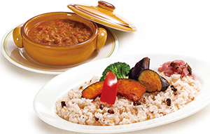 ライ麦や小豆など18種類の穀物をブレンドしたご飯の上に、長ナス、赤ジャンボピーマン、カボチャスライス、ブロッコリーを、色とりどりにトッピングしてヘルシー感を訴求。これらの野菜は、素揚げやボイルなど素材別に複数の調理法を駆使しており、それぞれの味わいを最大限に引き出している。