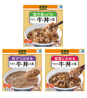 同シリーズは、高齢者からの「吉野家の牛丼をもう一度食べたい」という要望に応えたもの。咀嚼・嚥下機能が低下した人でも「吉野家の牛丼」を食べることができる。「牛丼の具」には、「やさしい牛丼の具」「やわらか牛丼の具」と、具材を細かくカットし、とろみを強めた「きざみ牛丼の具」の計3アイテムがラインナップされている。
