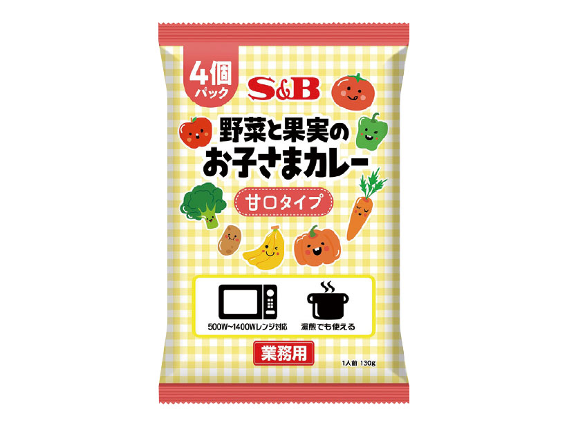 次はエスビー食品の「野菜と果実のお子さまカレー4個パック」。玉ネギやニンジン、トマト、ピーマンなんかの15種類の野菜と、リンゴやバナナなんかの7種類の果物が溶け込んだ甘口カレーやで。具材には国産のジャガイモとニンジンを使ってるねん。高出力の業務用電子レンジでスピーディーに加熱できる(1400Wで15秒)から、むっちゃ便利やわぁ。もちろん家庭用電子レンジや湯煎もできるから、オペレーションに応じて使い分けできるで。