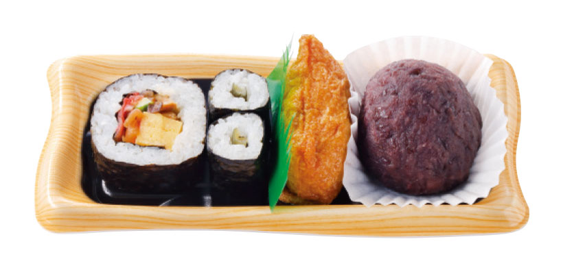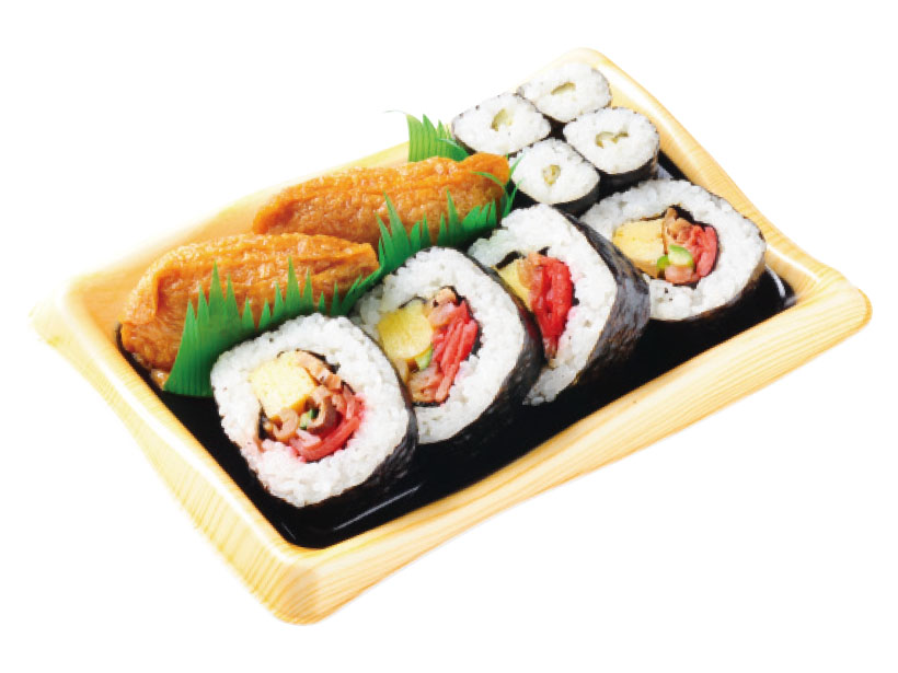 2000年の発売以来、弁当・すし分野で一番人気の助六寿司。年間販売数は約22万食に達する。見た目は平凡だが、一つ一つの食べ応えが洗練され、とりわけ太巻き具材の絶妙なバランスが秀逸。メリハリある重厚な見栄えも抜群。普通の助六がランチセットなら、サザエの助六はディナーコースといえるほど、先味・中味・後味の満足度が高い。本品を目当てに来店する出張客や観光客も増えているという。太巻きは、少し甘めに調味した厚切り卵が特徴。濃い口に調味した干瓢・椎茸と、食感のよいキュウリの相性もよし。北海道の太巻きには欠かせない紅ショウガのアクセントもニクイ。新香細巻きは、より風味を演出するため粕漬けを使った奈良漬けが決め手。道民にとっては慣れ親しんだサザエの定番だが、道外の人なら助六の奥深さに感心するだろう。