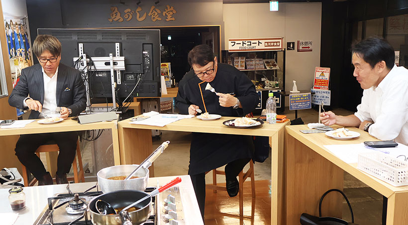 (左から)吉野家HDの河村泰貴取締役会長、「ナベノ-イズム」の渡辺雄一郎エグゼクティブシェフCEO、U.RAKATAの臼井健一郎代表が試食審査を行った