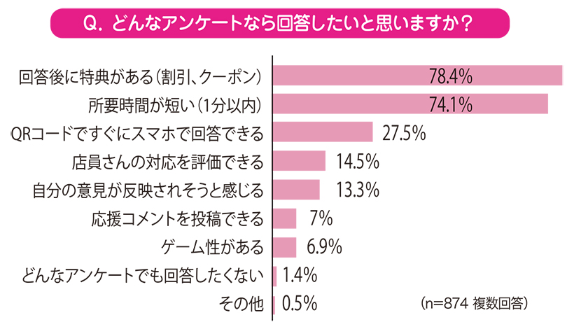 一方で、これまでアンケートに回答したことがない方の理由には、「面倒」「回答時間がない」など、手間への心理的なハードルが影響していることもわかりました。回答してもよいと思えるアンケートは「回答後に特典がある(割引・クーポン)」ものが78.4%と最多で、次いで「所要時間が短い(1分以内)」ものが74.1%となりました。