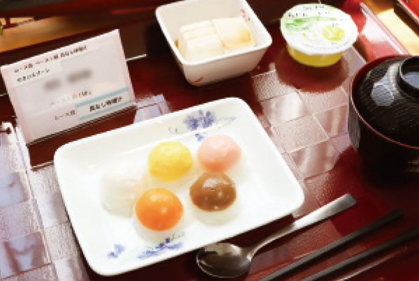 エビ、卵、ウナギ、鯛、サーモンのムース食の寿司も提供している