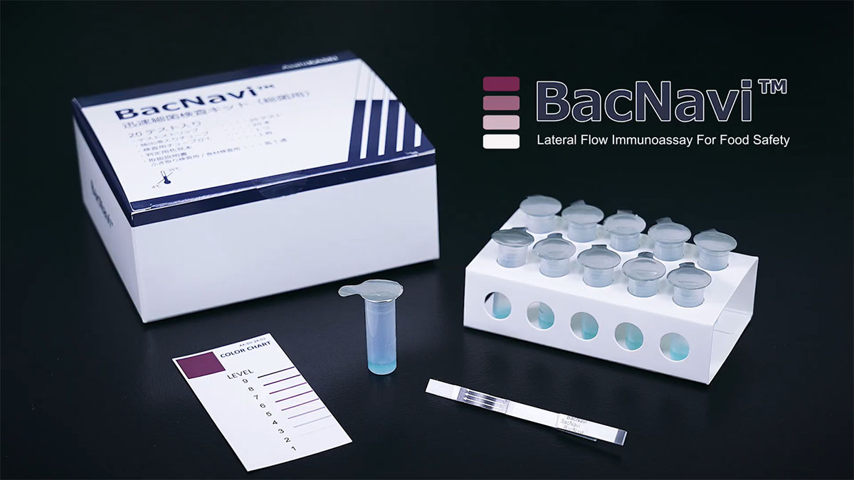 BacNaviは、総菌数(生菌数と死菌数の合計)を測定できる検査キット。操作手順は簡単で、食材や食品製造環境などの検体から試料液を作製し、ストリップを浸して30分待つだけ。菌が存在する場合はストリップ上に紫色のラインが出現する(総菌数が約1万cfu/㎖未満はラインが出現しないので陰性と判定)。菌数が多いほどラインの色が濃くなるため、段階的に半定量的な評価(レベル1~9)も可能である。見本のカラーチャートと比較すれば誰でも簡単・確実に結果を判定できる。芽胞菌や嫌気性菌、損傷菌のような検査時の取り扱いや判定が難しい菌、低温細菌のような公定法ではリスクの過小評価が危惧される菌なども含め、包括的な微生物リスクを評価できるツールとして、今後活用の幅が広がると期待される。