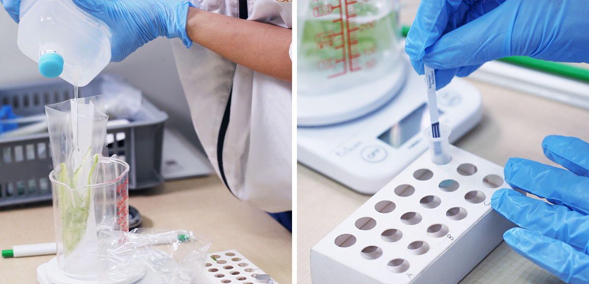 カット野菜を製造するザ・ネクストワンの本社工場では、以前から一部商品で微生物に起因する品質劣化の発生に悩まされていた。そこで昨年から簡便・迅速に総菌数を半定量評価できる旭化成㈱の迅速細菌検査キット「BacNavi™︎(バクナビ)」を導入。殺菌後の野菜の菌数測定と加工環境の拭き取り検査で同キットを用いたところ、品質劣化によるクレームはほぼゼロになったという。