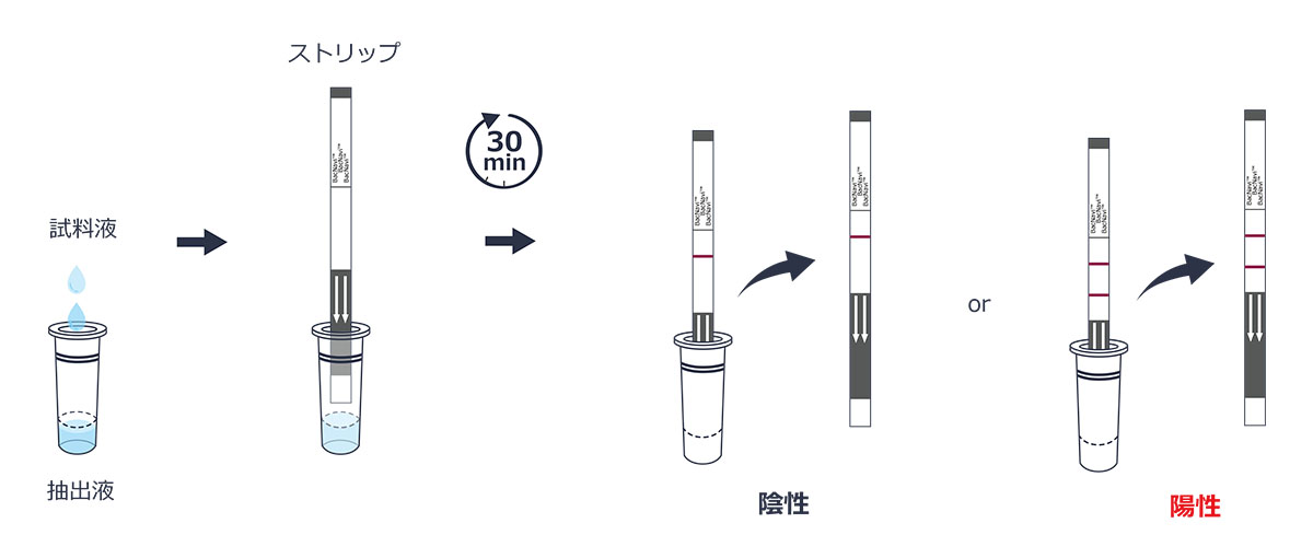 また、細菌が保有するリボソーム(細胞内でタンパク質を合成する場)抗原に反応する抗体をイムノクロマト法で検出するという、市販の微生物検査キットではほかに類を見ない原理を採用。リボソームの産生に関与するアミノ酸配列のうち「細菌に共通の部分」に対する抗体にイムノクロマト法を適用することで、細菌の有無や存在量を検出する。