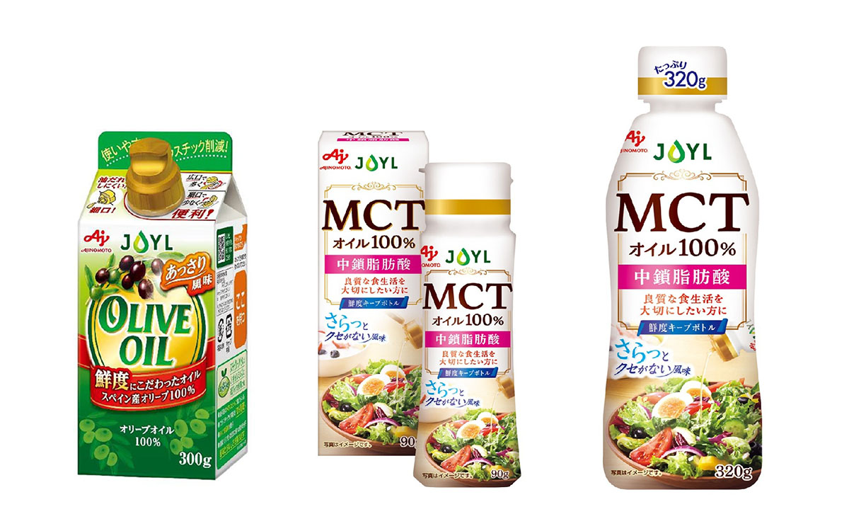 要注目なのが、注目ジャンル・MCTへの本格参入製品であるJOYL「AJINOMOTO MCTオイル」。MCTは健康・美容、介護・医療などの分野で注目されており、同社の参入によりさらなる認知向上や浸透が期待される。同品はクセのないさらっとした風味で、サラダやヨーグルト、スープなど幅広く活用できる。90g・320gの2サイズで展開し、ともに少量でも注ぎやすく液だれしにくい「鮮度キープボトル」を採用、使いやすさと保存性も両立している。