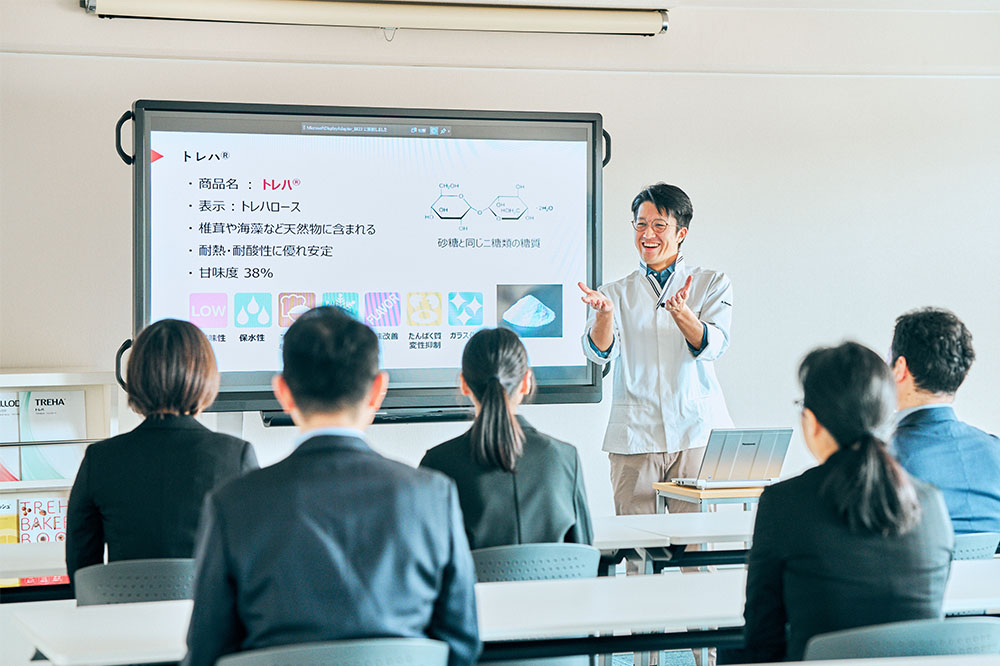 濱野 当社は「糖のスペシャリスト」として、さまざまな食品のアプリケーション開発に取り組んでいますが、「糖は『トレハ』だけ使えば、おいしい和菓子ができる」ものではなく、「トレハ」は優れた機能を有する素材ですが、それを使えばすべての課題が解決できるものでもありません。糖類を見ても砂糖をはじめ、たくさんの種類があります。「トレハ」と他の糖類をどのような組み合わせで利用すれば、素材の特徴を最もうまく引き出せるのかを、考慮しながら鋭意検討しています。